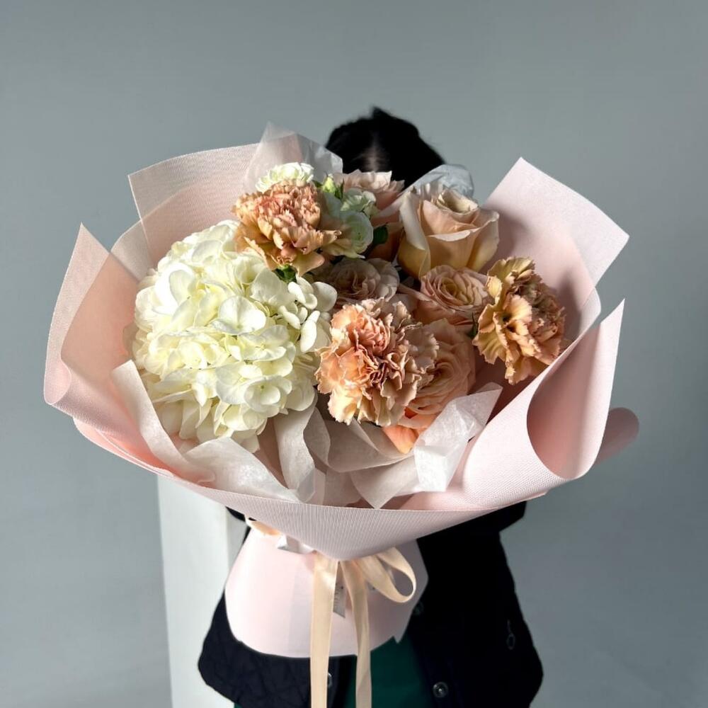 Гортензия – 1 шт. Роза – 5 шт. Кустовая роза – 1 шт. Диантус – 3 шт.