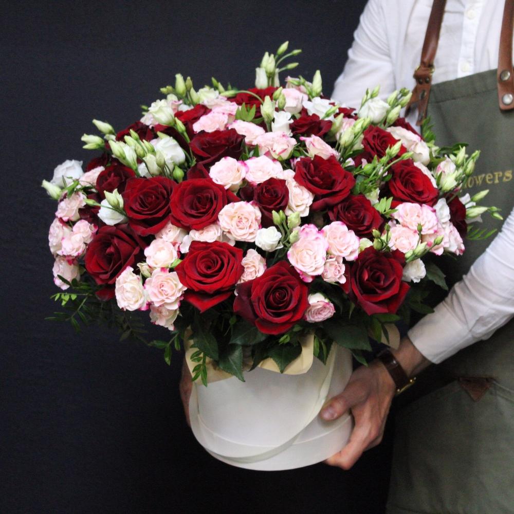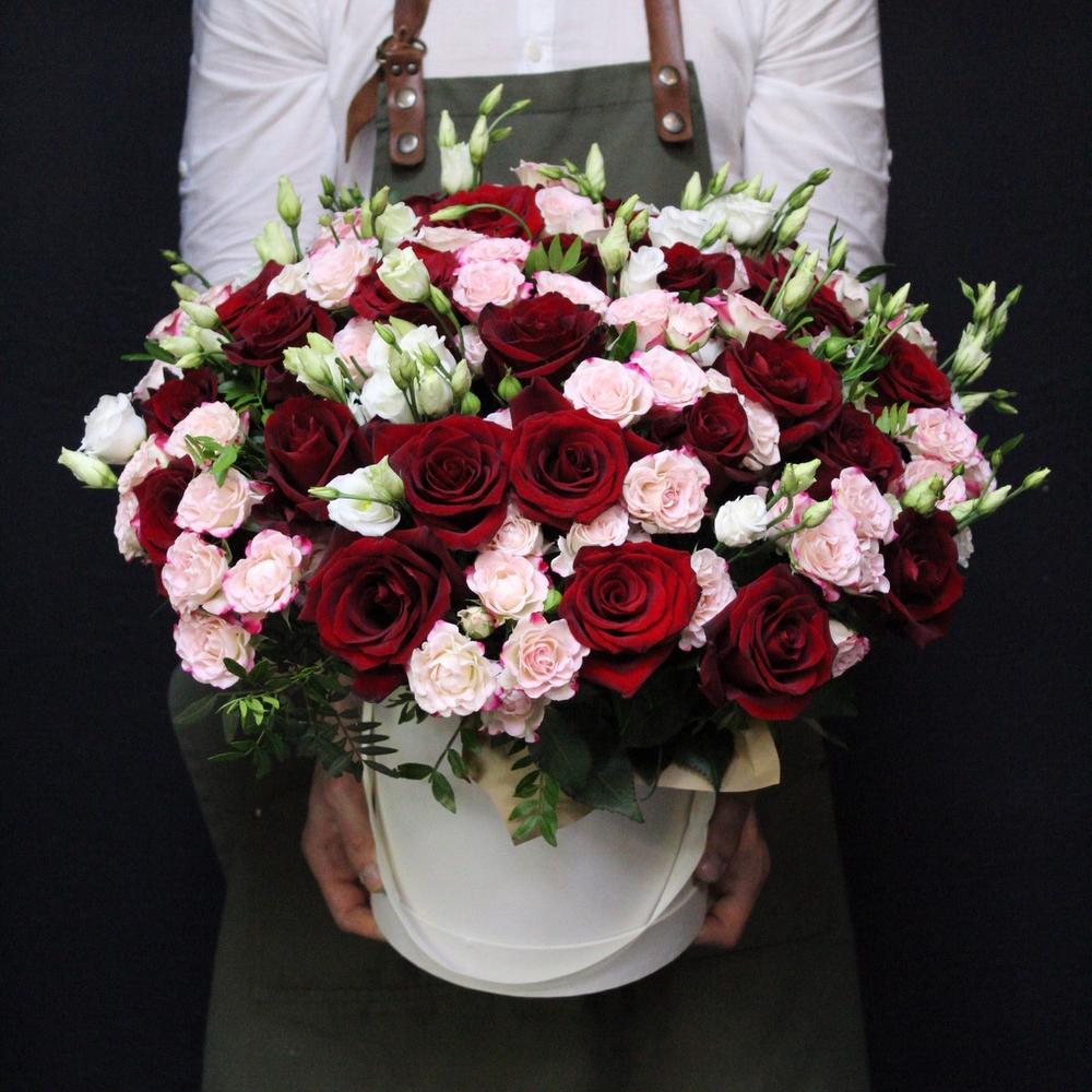 роза кустовая мадам бомбастик – 15 шт.Роза Эквадор – 35 шт.Лизиантус белый – 10 шт.Фисташка – 5 шт.Коробка шляпная – 1 шт.Оазис флористический – 2 шт.Атласная лента – 1 шт.