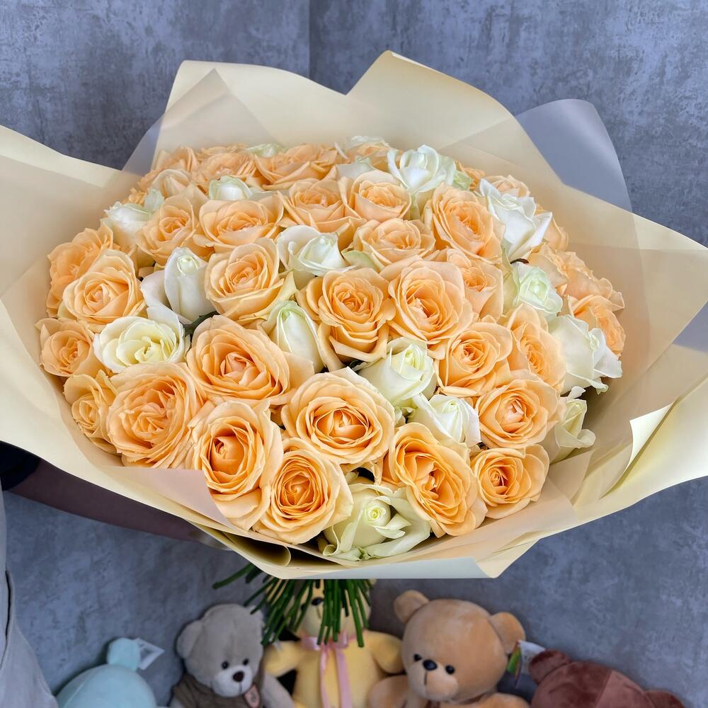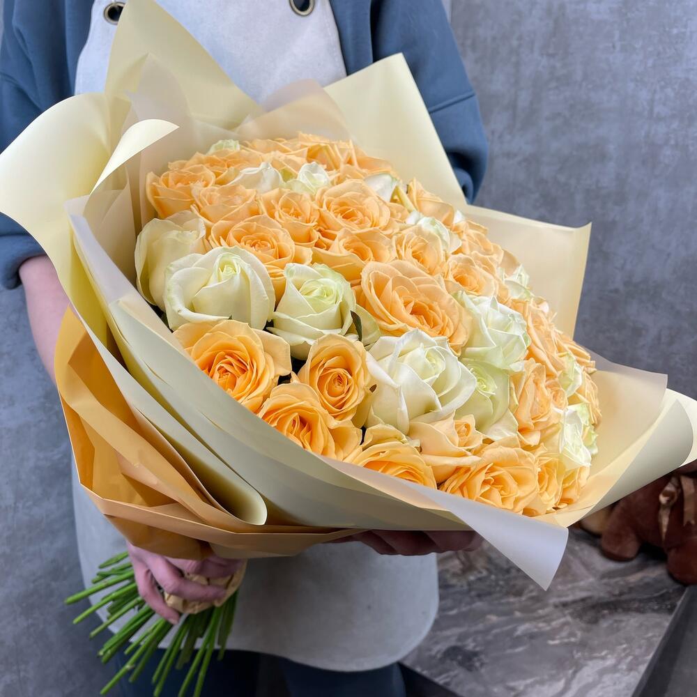 Букет 51 шт. из элитных белых и персиковых роз