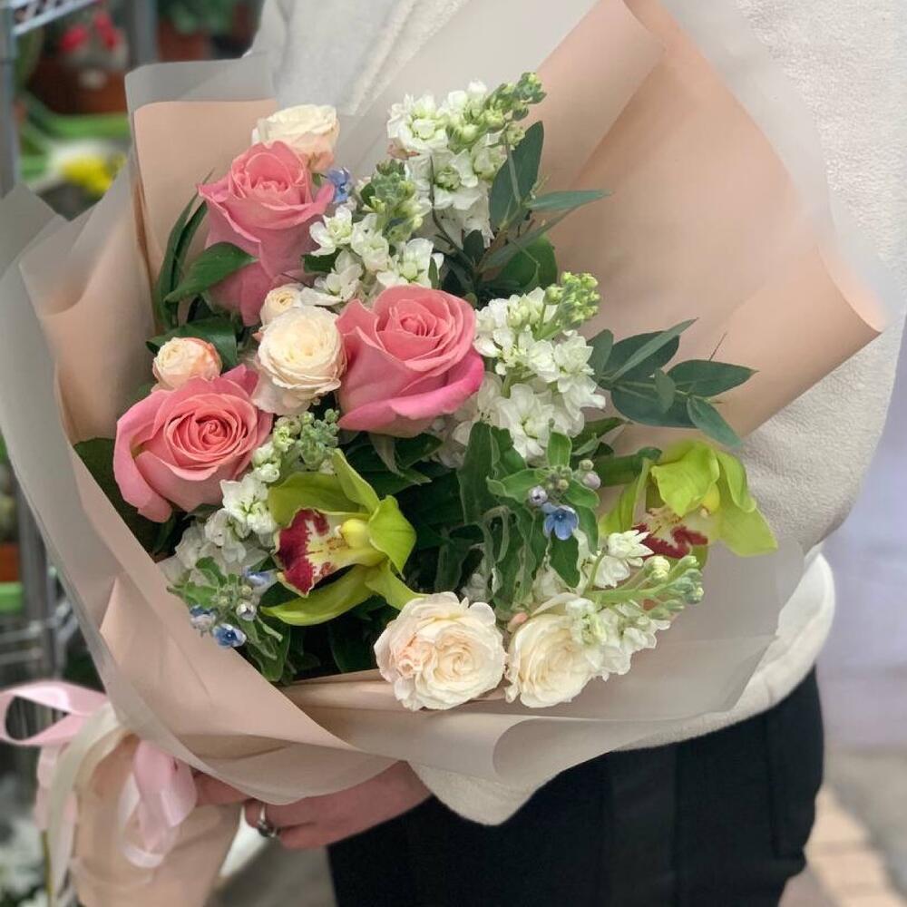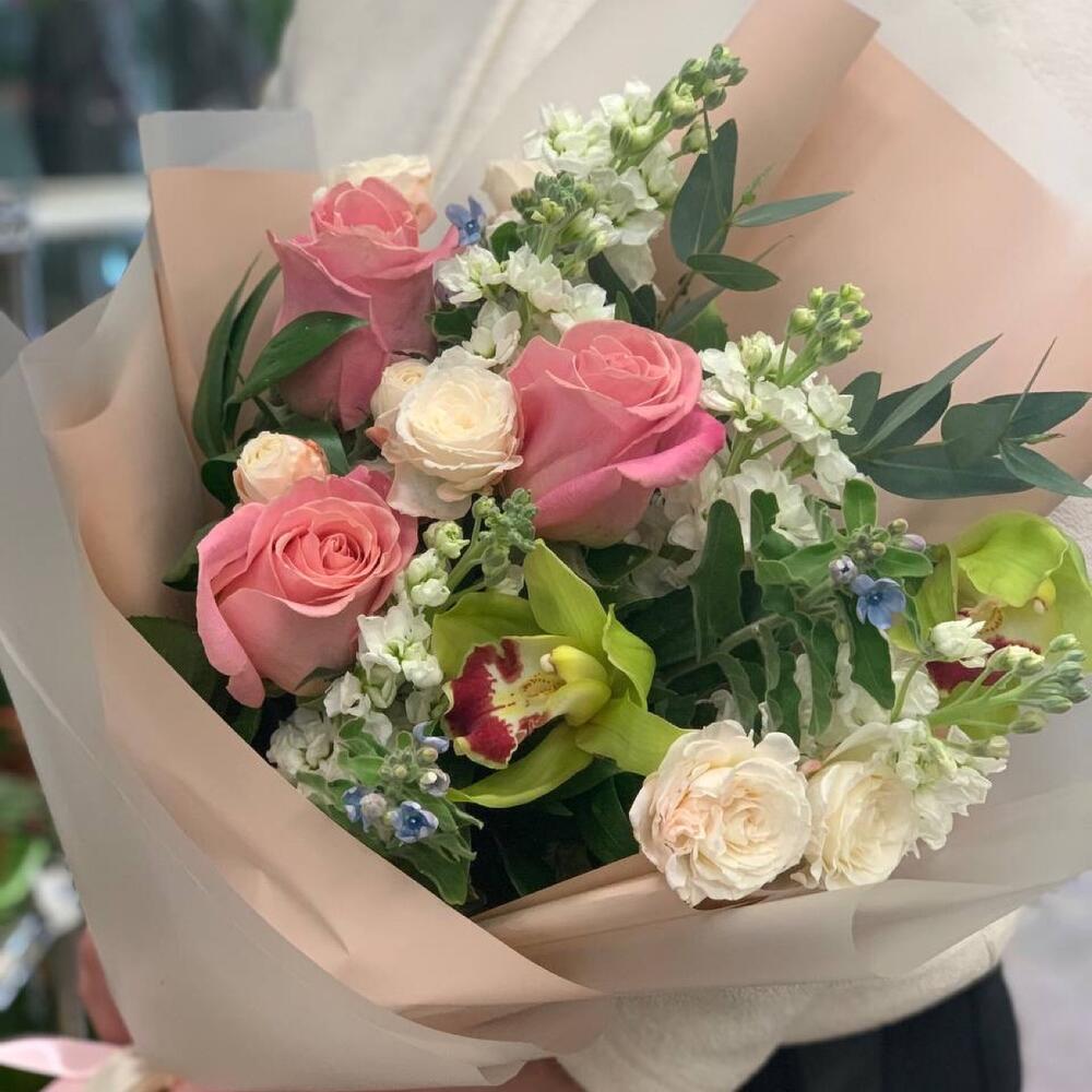 Роза Эквадор – 3 шт.Твидия – 3 шт.Роза кустовая – 3 шт.Орхидея Цимбидиум – 2 шт.Зелень – 5 шт.Упаковка дизайнерская – 2 шт.Лента атласная – 2 шт.