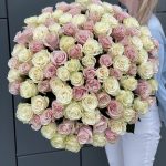 белая роза mondial – 51 шт. розовая роза pink mondial – 50 шт. Лента атласная – 1 шт.