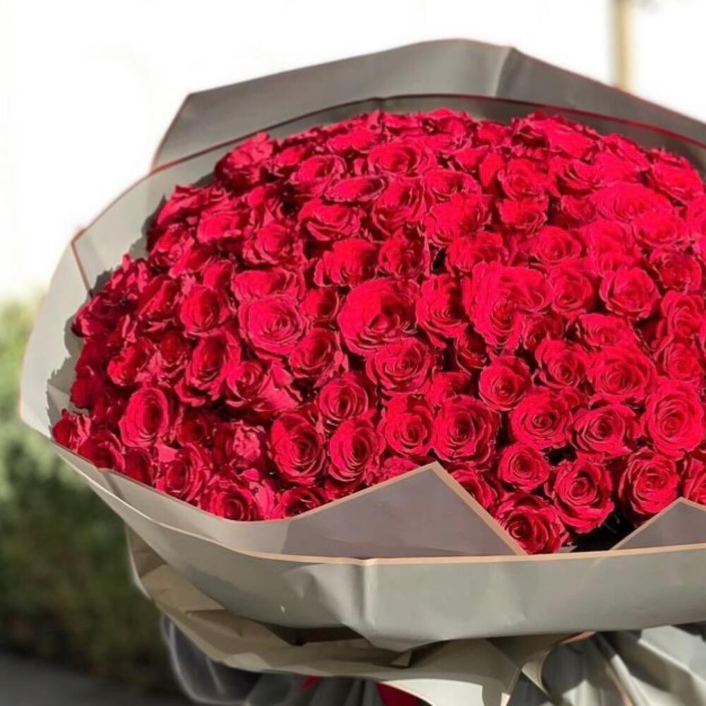 Алая роза – 151 шт.Упаковка дизайнерская – 1 шт.Лента атласная – 2 шт.Открытка – 1 шт.инструкция по уходу за цветами – 1 шт.хорошее настроение – 100 шт.коробка переноска – 1 шт.Кризал – 1 шт.