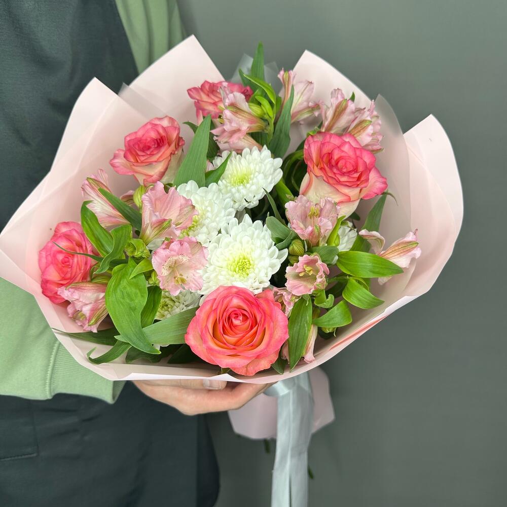 Букет из альстромерий, роз и кустовой хризантемы