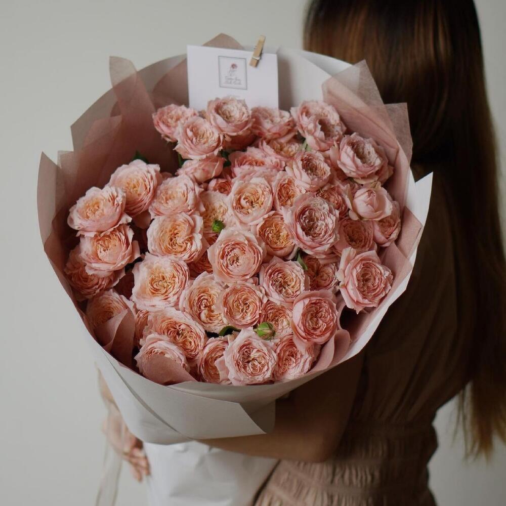 розы пионовидные кустовые – 31 шт.Упаковка дизайнерская – 2 шт.Лента атласная – 2 шт.Открыточка с вашими пожеланиями – 1 шт.хорошее настроение – 100 шт.инструкция по уходу за цветами – 1 шт.коробка переноска – 1 шт.Кризал – 1 шт.