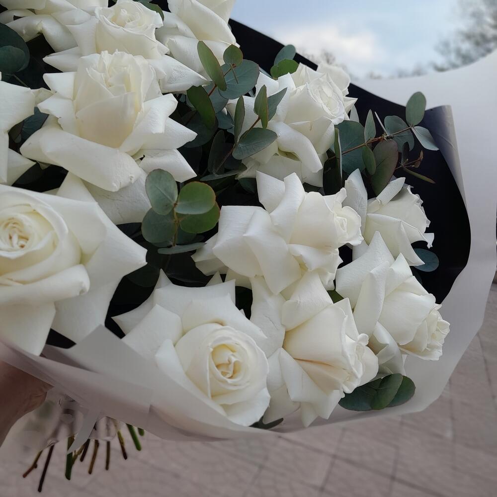 Эвкалипт – 6 шт.Лента атласная – 3 шт.Упаковка дизайнерская – 4 шт.Роза французская – 13 шт.
