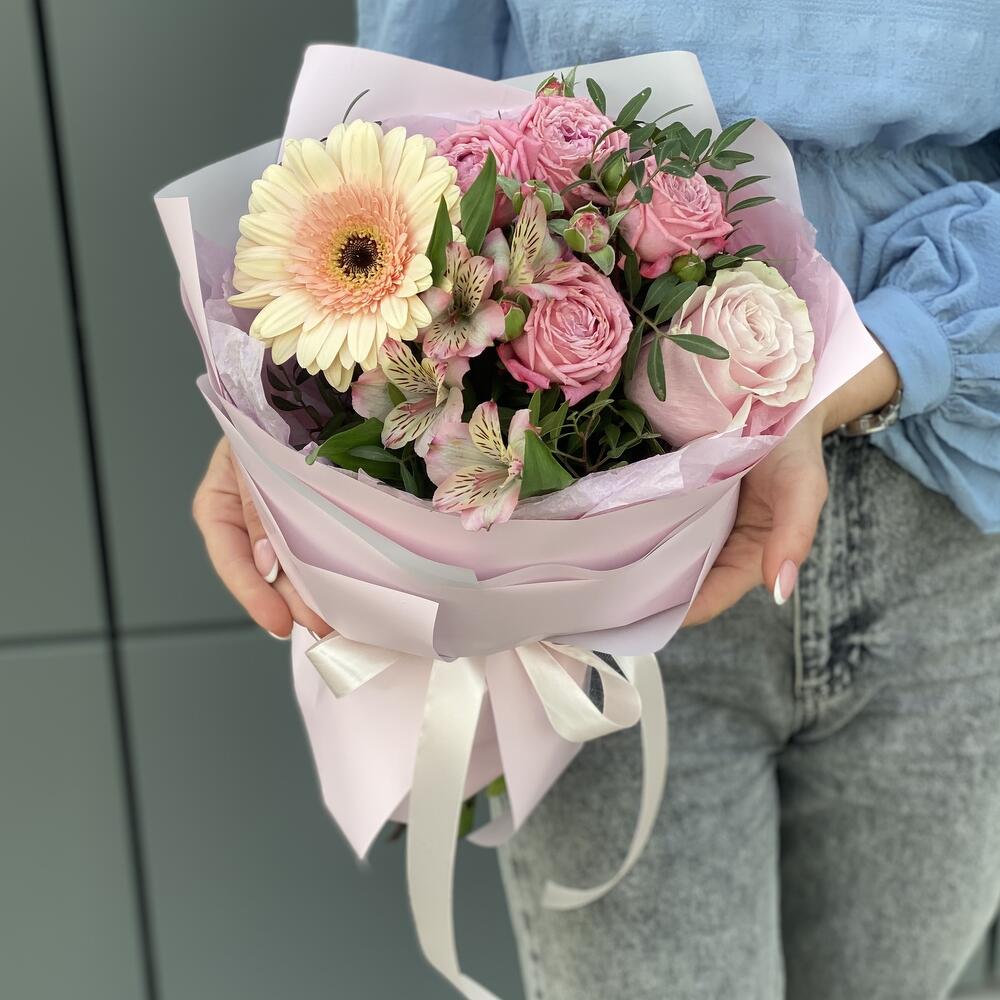 Альстромерия – 1 шт. Писташ – 2 шт. Оформление – 1 шт. герберы – 1 шт. кустовая роза артезия – 1 шт.