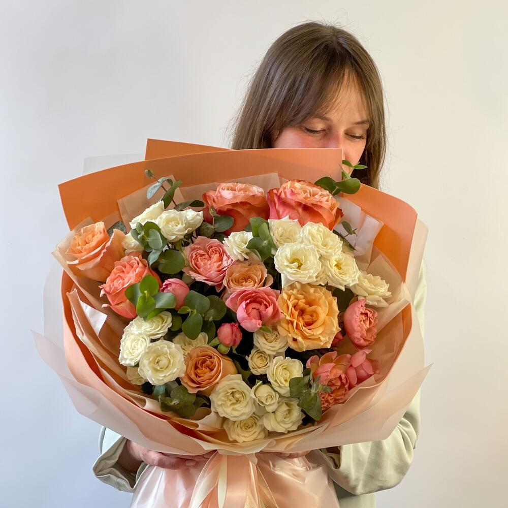 Лента – 2 шт.Роза кустовая – 4 шт.Эвкалипт – 3 шт.Роза одноголовая – 7 шт.Роза кустовая пионовидная – 3 шт.Упаковка дизайнерская – 3 шт.