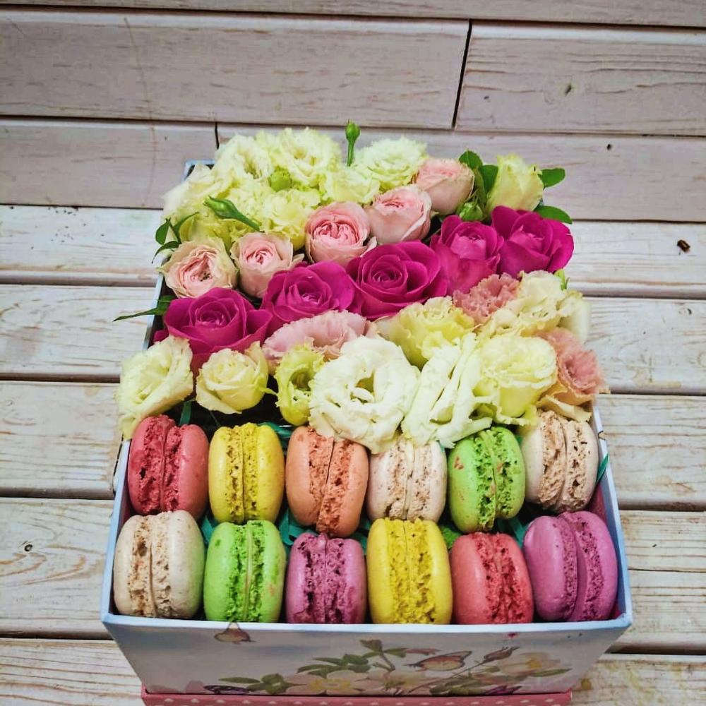 Пирожные макарон – 12 шт.Роза – 5 шт.Кустовая роза – 2 шт.Эустома – 5 шт.Коробка – 1 шт.Оазис флористический – 1 шт.