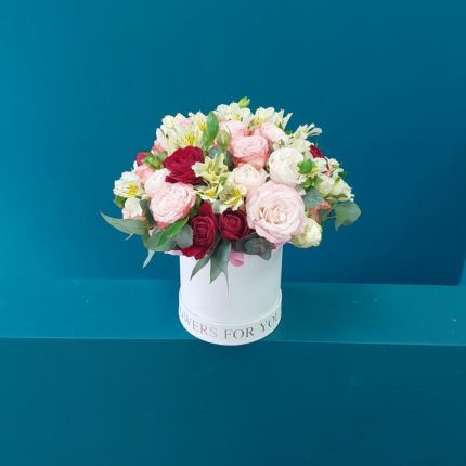 Коробка с цветами и место под подарок ,клиент может написать какие сладости поставить ,на сумму не выше 6000 др место торта