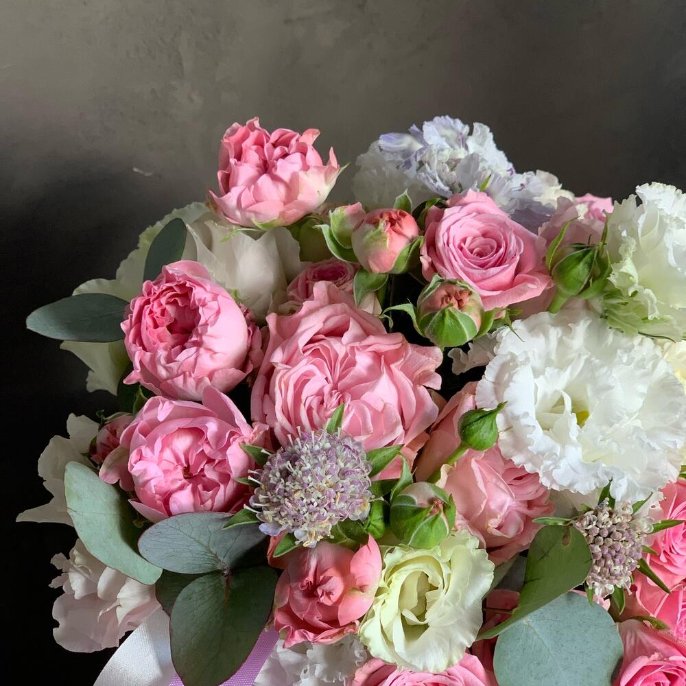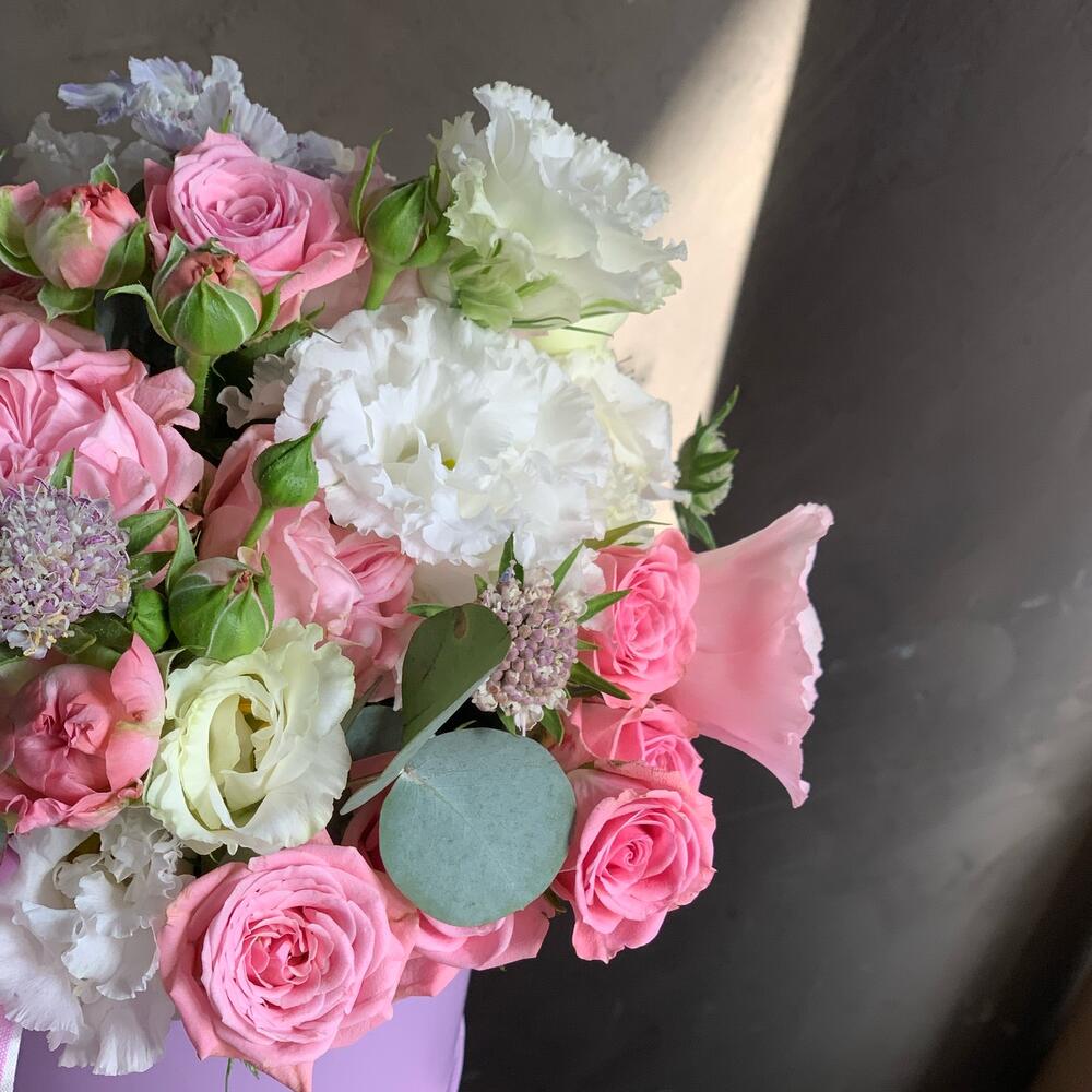 Шляпная коробка – 1 шт.Оазис флористический – 1 шт.ленты атласные – 2 шт.Кустовая роза – 3 шт.Лизиантус – 3 шт.Эвкалипт – 5 шт.