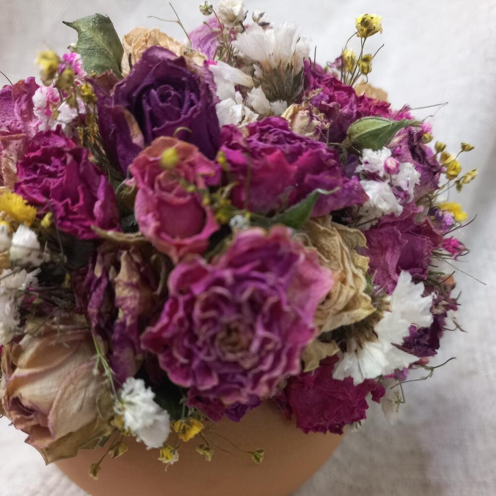 роза кустовая микс сухоцвет – 23 шт.статица сухоцвет – 2 шт.гипсофила сухоцвет – 3 шт.Оазис флористический – 1 шт.горшочек с крышкой керамический – 1 шт.