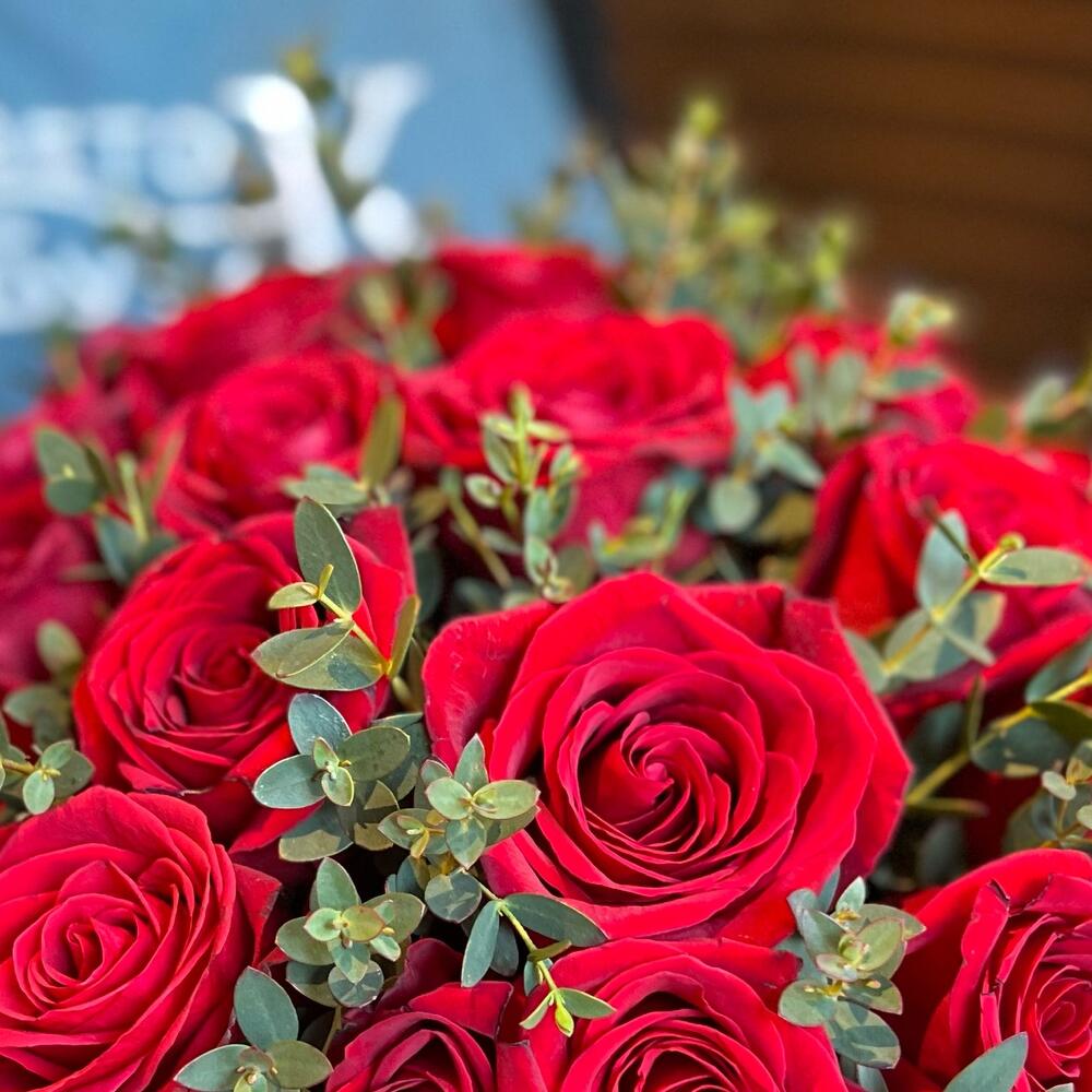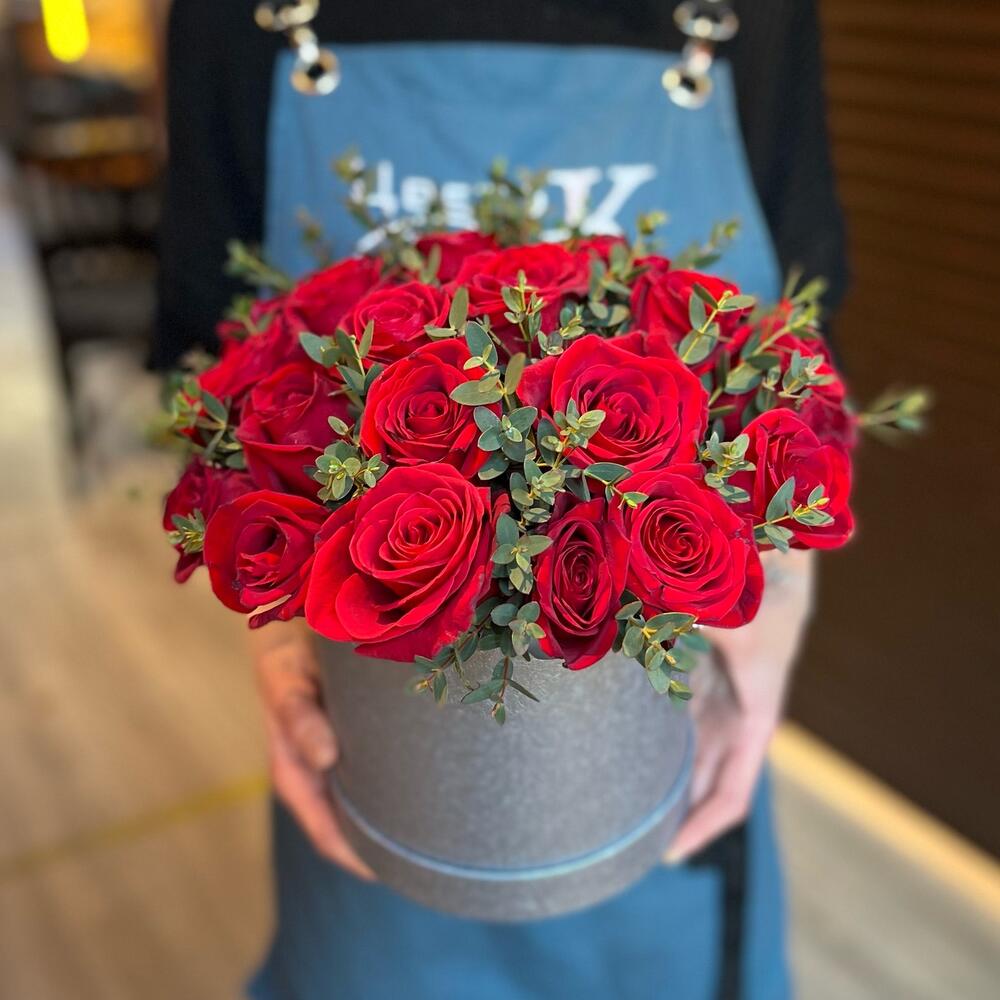 Роза Эквадор Красная – 25 шт.зелень эвкалипта – 2 шт.Коробка шляпная – 1 шт.Оазис флористический – 1 шт.