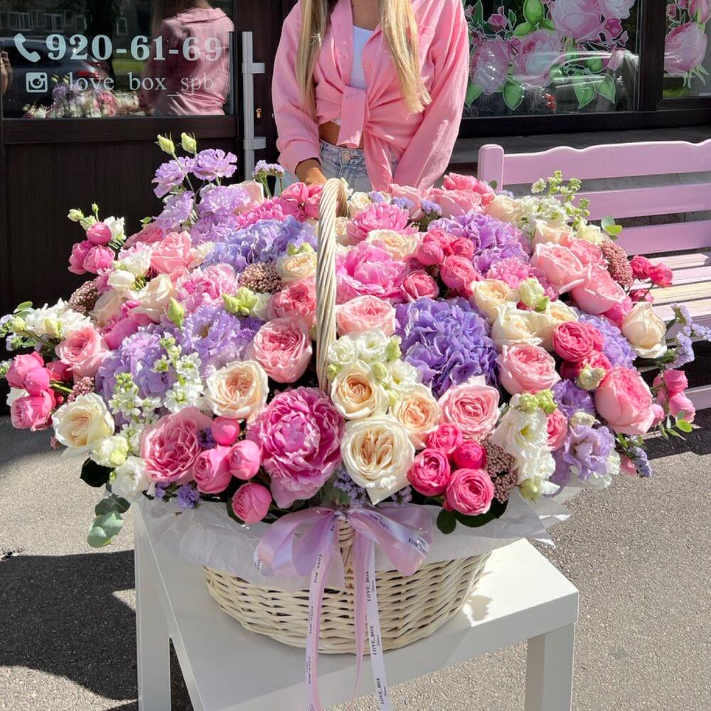 Гортензия – 4 шт.Роза пионовидная – 25 шт.Роза Эквадор – 20 шт.Пион – 10 шт.Роза кустовая – 10 шт.Лизиантус – 15 шт.Статица – 5 шт.Озотамнус – 6 шт.Корзина плетеная – 1 шт.Дизайнерская упаковка – 5 шт.