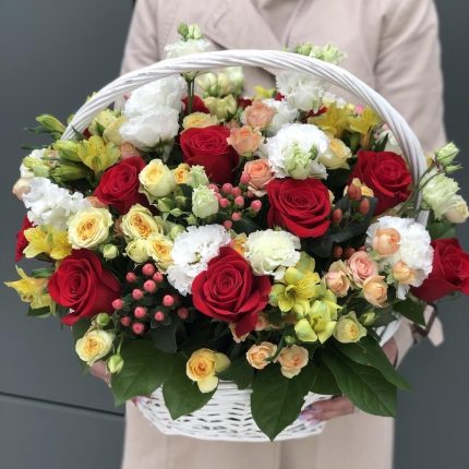 Корзина – 1 шт. Оазис – 3 шт. Кустовая роза – 3 шт. Альстромерия – 5 шт. Эвкалипт – 3 шт. Трахелиум – 3 шт. Агапантус – 3 шт. Антуриум – 2 шт. Эустома – 6 шт. Питтоспорум – 1 шт. Оформление – 1 шт.