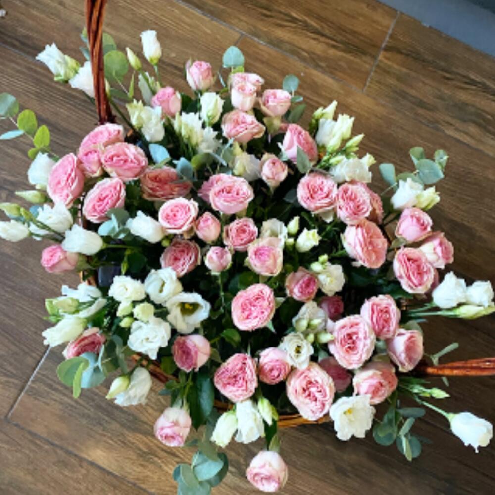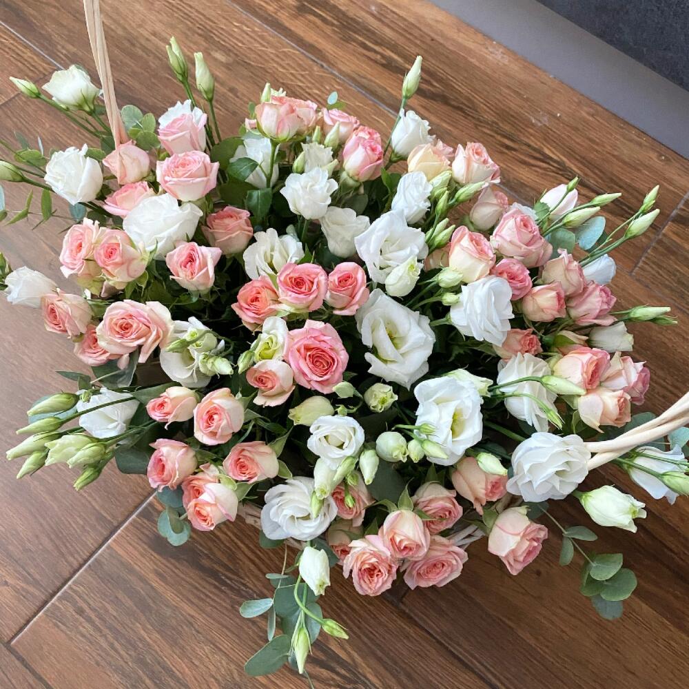 Лизиантус – 10 шт.Роза кустовая – 15 шт.Эвкалипт – 7 шт.Корзина плетеная – 1 шт.Оазис флористический – 1 шт.