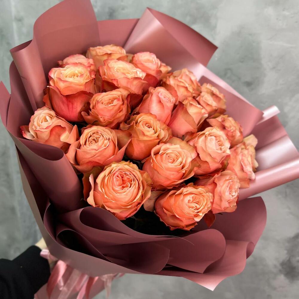 Пионовидная роза кахала – 25 шт.Упаковка дизайнерская – 5 шт.Лента атласная – 2 шт.