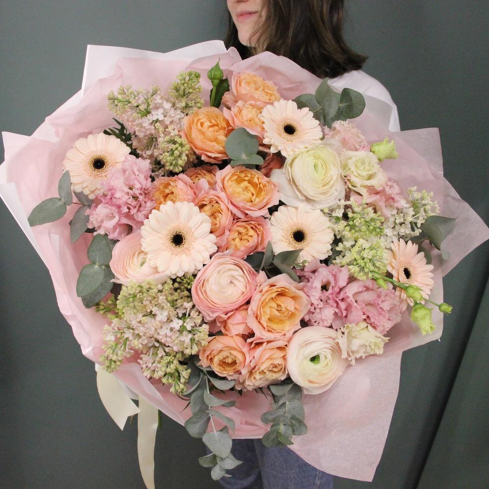Лизиантус – 3 шт.Гербера – 5 шт.Роза кустовая пионовидная – 4 шт.Эвкалипт – 9 шт.Упаковка дизайнерская – 2 шт.Пион – 5 шт.Упаковка – 1 шт.Ранункулюс – 5 шт.
