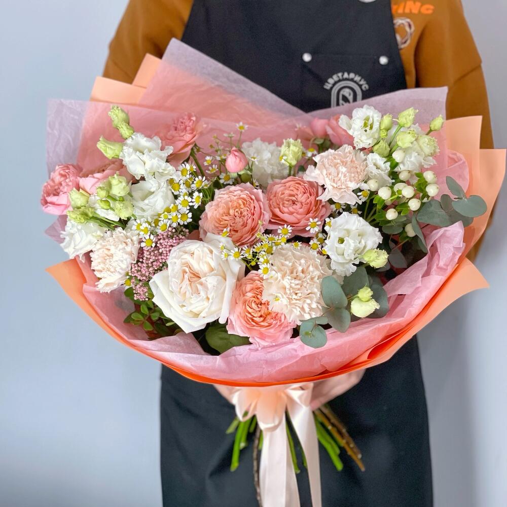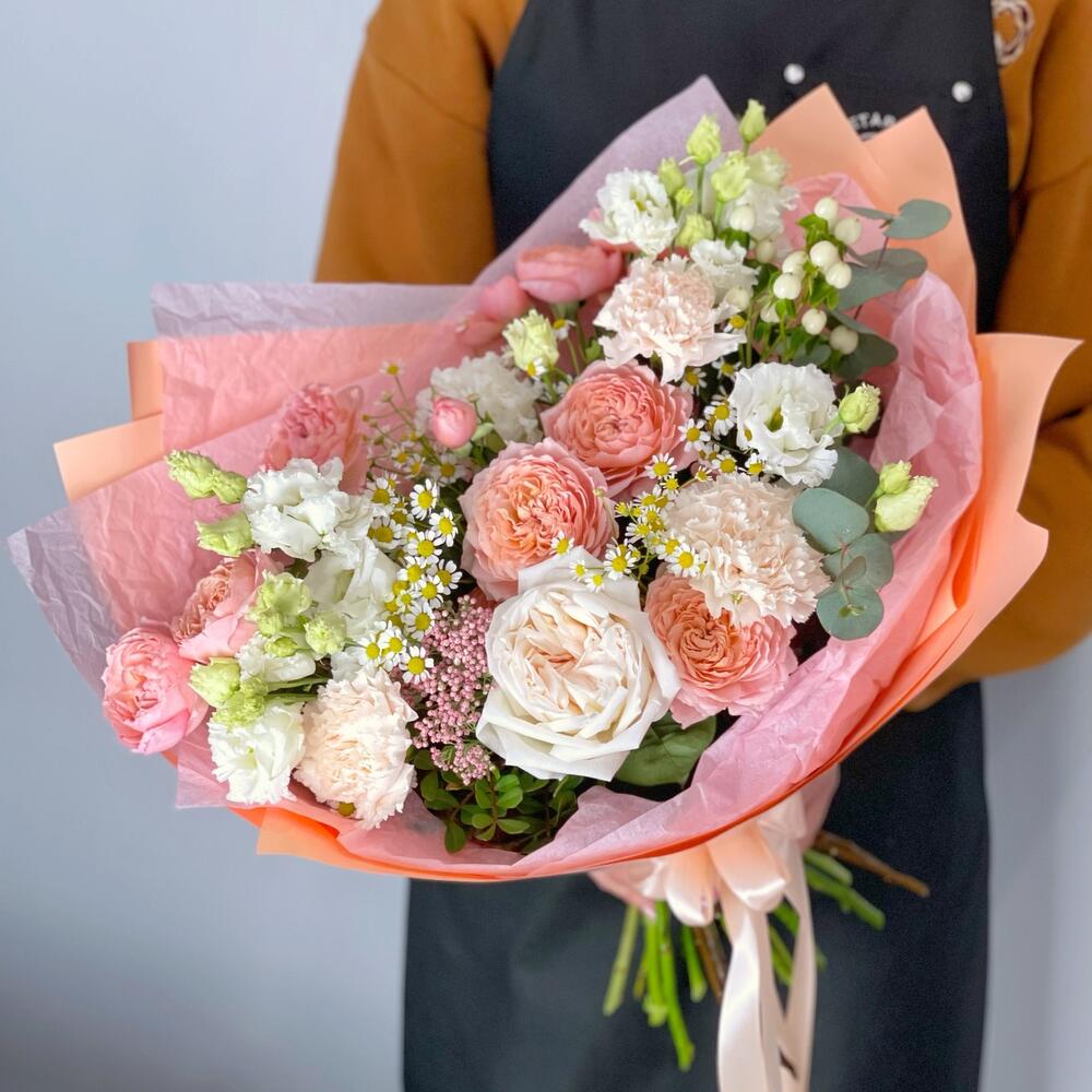 Букет в персиковой нежной гамме с очаровательными кустовыми пионовидными розами Джульетта, ароматными розами Вайт Охара, белыми лизиантусами и гвоздиками.Шикарный подарок на день рождения любимой девушке, маме, подруге.К каждому букету мы прикладываем:- открытку с Вашими пожеланиями- инструкцию по уходу за букетом- подкормку для цветов