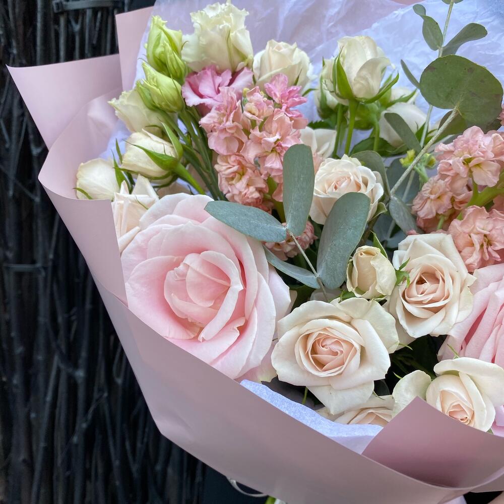 Роза одноголовая – 2 шт.эустома махровая розовая – 1 шт.Эвкалипт – 2 шт.Роза кустовая – 4 шт.Маттиола – 3 шт.Упаковка дизайнерская – 5 шт.Тишью белое – 2 шт.