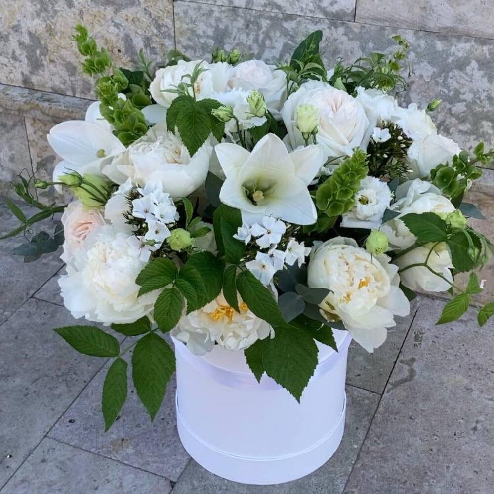 лилия лонг – 3 шт.ирландский колокольчик – 5 шт.Роза пионовидная – 5 шт.Флокс – 5 шт.Лизиантус – 7 шт.Ветки малины – 5 шт.Маттиола – 7 шт.Эвкалипт – 5 шт.Пион – 7 шт.Коробка шляпная – 1 шт.Оазис флористический – 2 шт.