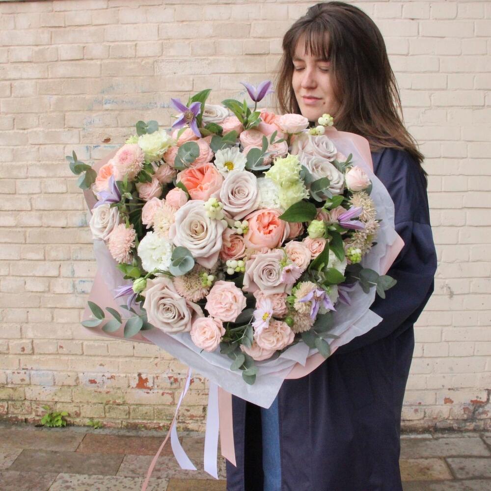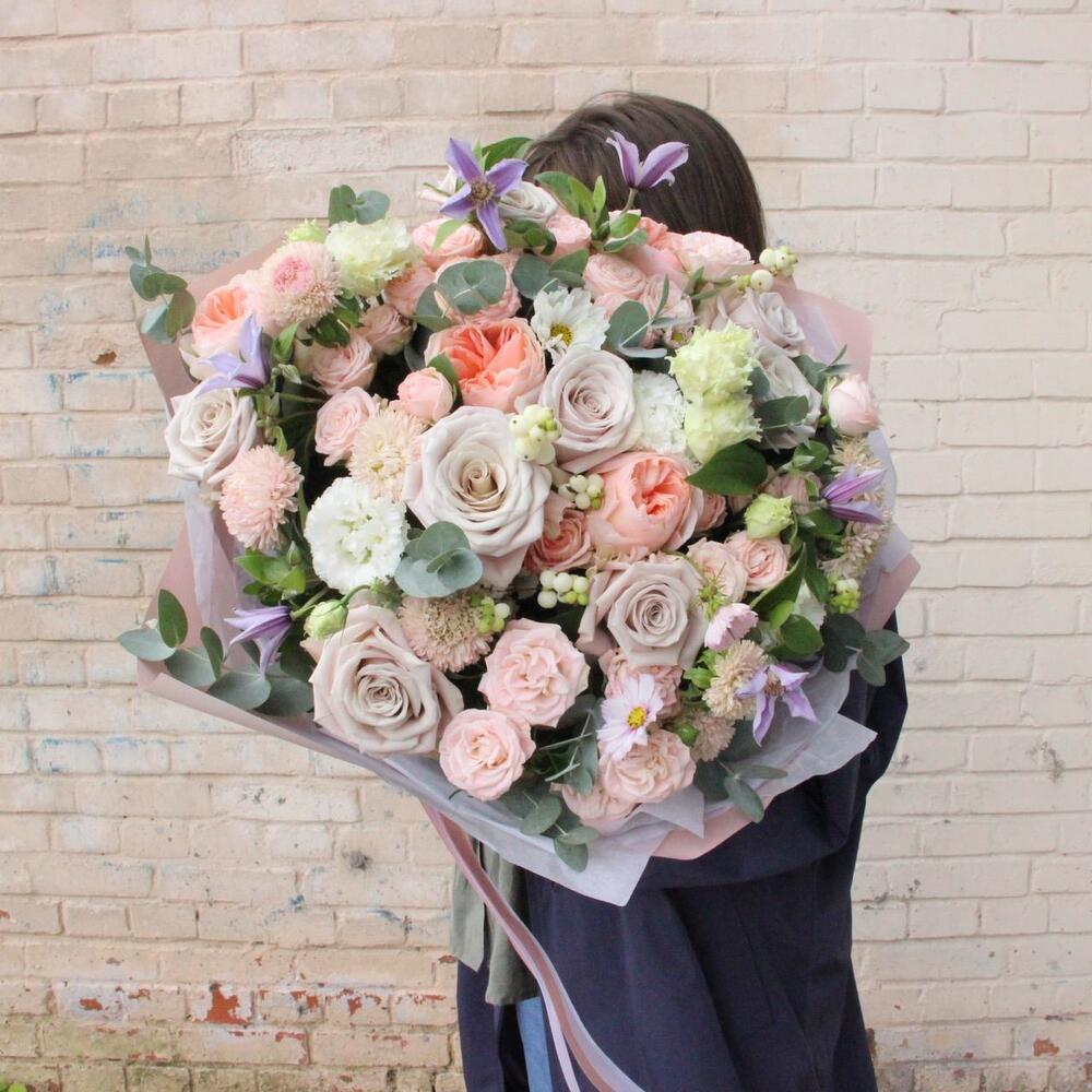 Садовый букет с пионовидными розами, эустомой, клематисом и эвкалиптом.Букет приедет в подарочной коробке, с рекомендациями по уходу за цветами.При необходимости, если букет с нежными цветами или ему предстоит весомое время в дороге – то цветы мы отравляем на воде, останется лишь аккуратно снять кулёчек с водой и поставить букет в подходящую вазу.К каждому букету мы подписываем открытку с вашим посланием – эта услуга, так же в подарок.