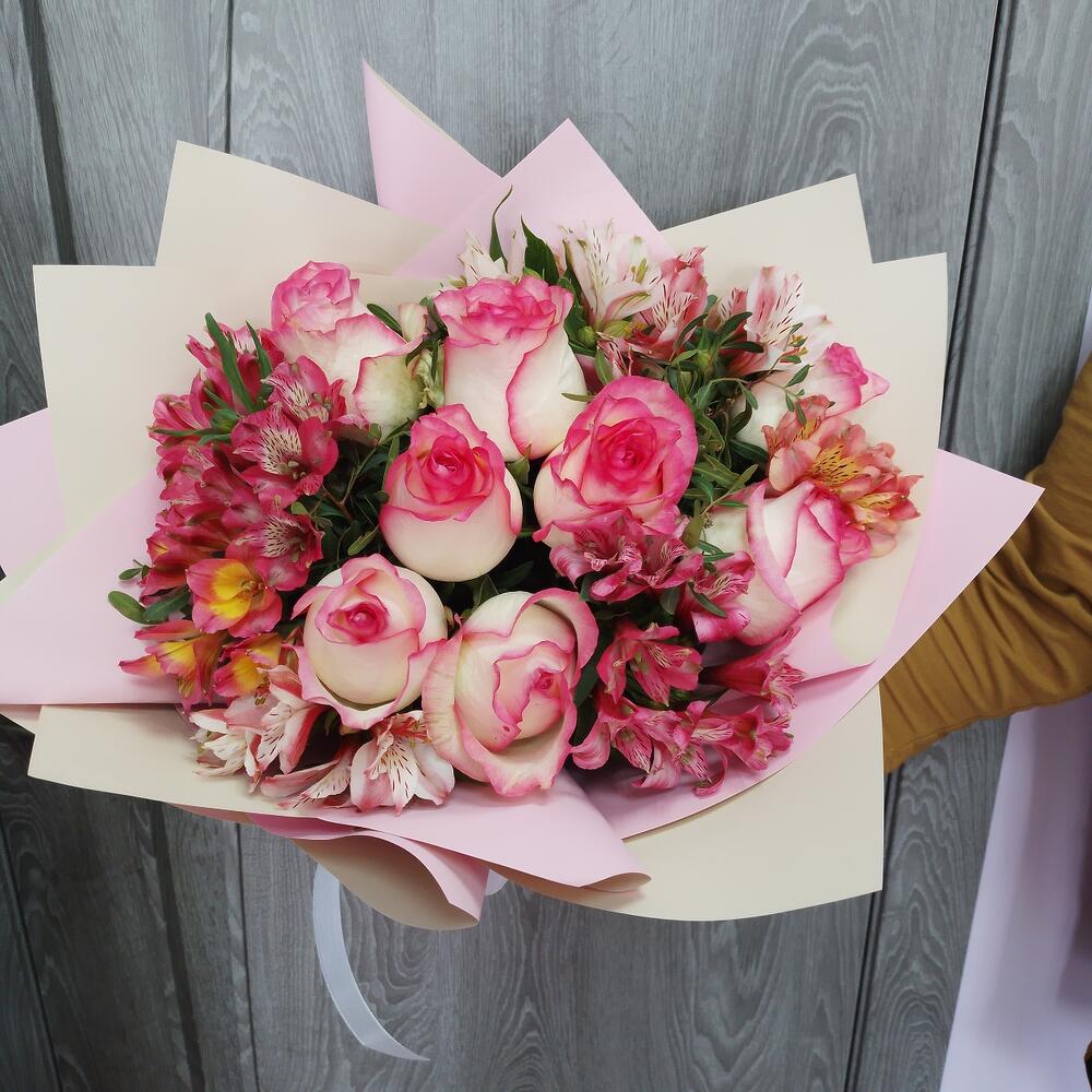 Альстромерия – 7 шт.Роза Джумилия – 7 шт.Фисташка пучок – 1 шт.Упаковка дизайнерская – 1 шт.Лента атласная – 1 шт.