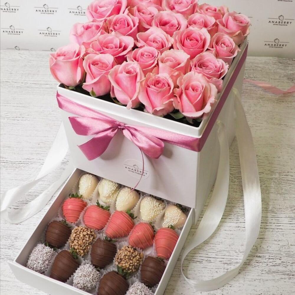 -25 розовых роз-клубника в бельгийском молочном, белом и розовом шоколаде 20 шт (кондитерские посыпки, кокосовая стружка, ореховая стружка) размер коробки 20*20*20 см