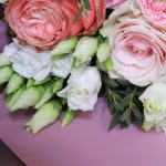 роза фруттето – 5 шт.Роза пионовидная кахала – 4 шт.Эустома – 3 шт.пионовидная кустовая роза мадам бомбастик – 2 шт.Диантус – 3 шт.Эвкалипт – 3 шт.Пленка матовая – 3 шт.Лента атласная – 2 шт.