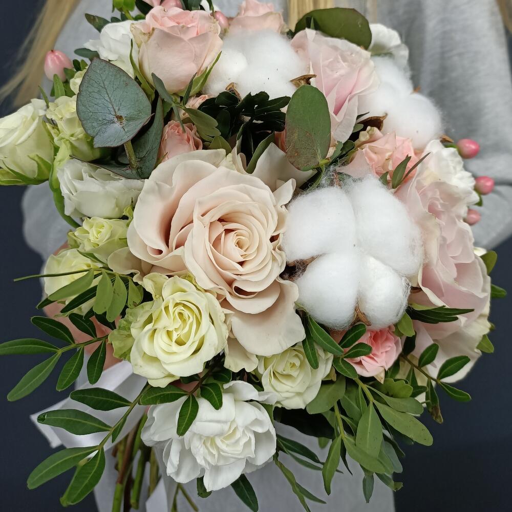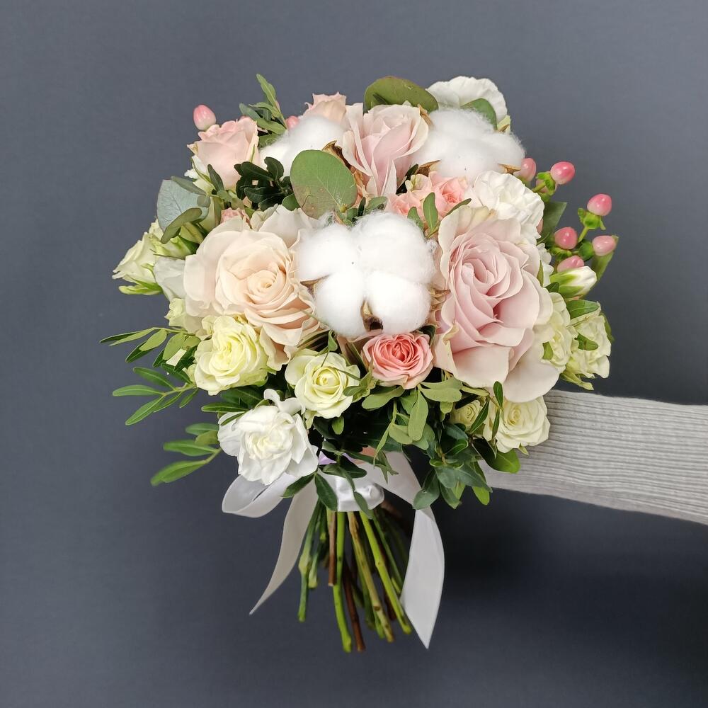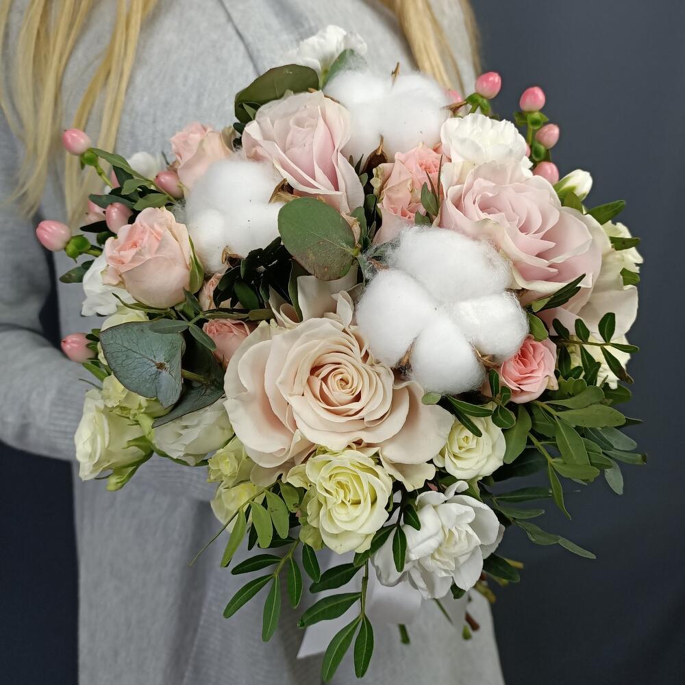 Свадебный букет Нежность с розами и хлопком