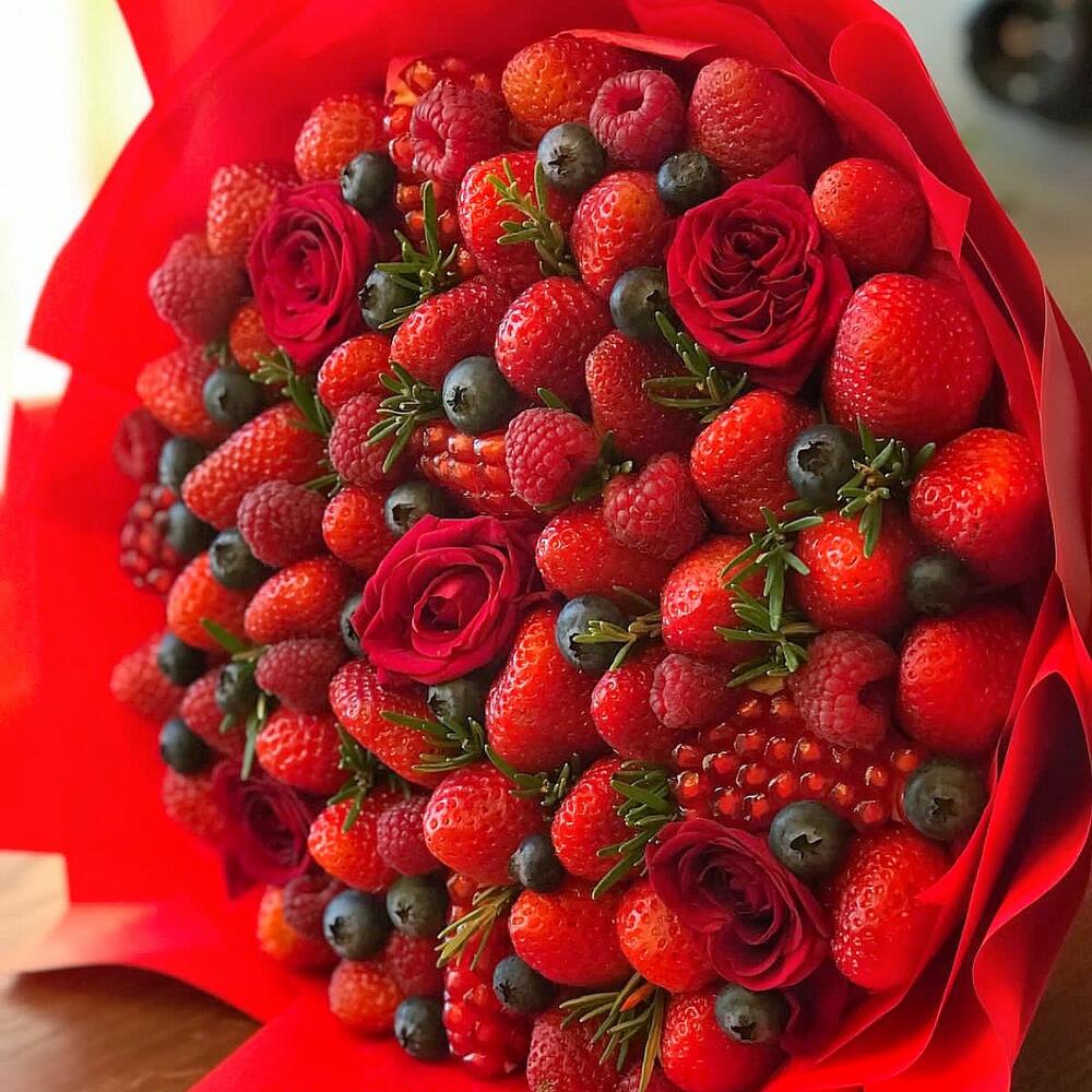 Кустовая роза – 3 шт.Клубника – 500 гр.голубика или малина – 125 гр.Гранат – 1 шт.Стильная упаковка – 1 шт.Прозрачная пленка – 1 шт.Розмарин – 10 шт.Открытка – 1 шт.Аталасная лента – 1 шт.