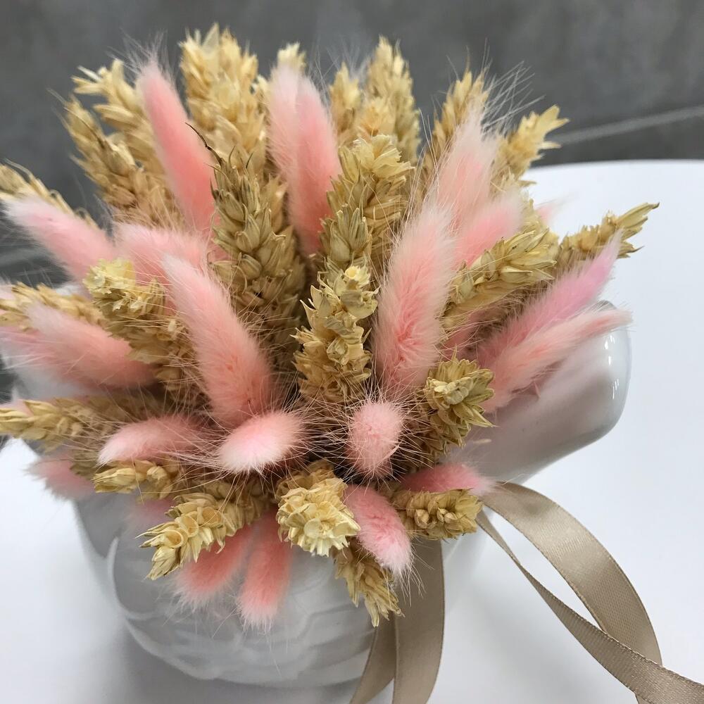 Лента атласная – 1 шт.Оазис флористический – 1 шт.лагурус пучок – 5 шт.колосья пшеницы пучок – 5 шт.птица декоративная керамика – 1 шт.