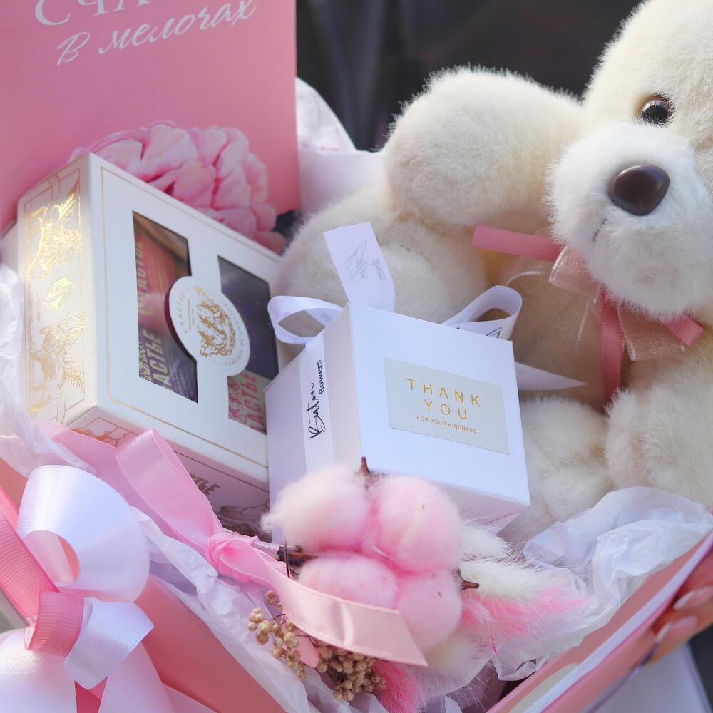 Подарочная коробка – 1 шт.Открыточка с вашими пожеланиями – 1 шт.плюшевый мишка – 1 шт.букет из сухоцветов – 1 шт.драже в красивой коробка – 1 шт.набор конфет “счастье” – 1 шт.