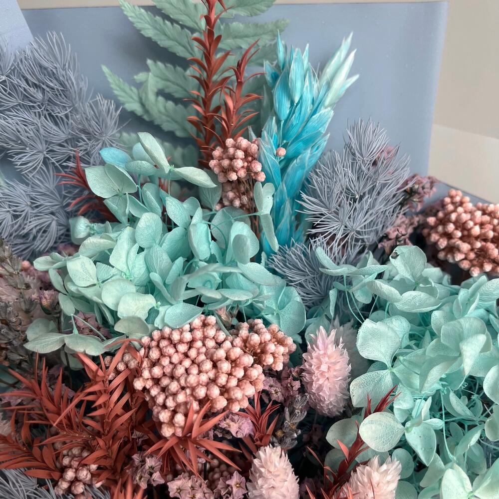 Лаванда – 13 шт.Лимониум – 2 шт.Озотамнус – 2 шт.Аспарагус – 1 шт.Упаковка дизайнерская – 1 шт.Овес – 5 шт.чайное дерево – 2 шт.гортензия стабилизированная – 1 шт.пароротник – 1 шт.Фаларис – 11 шт.